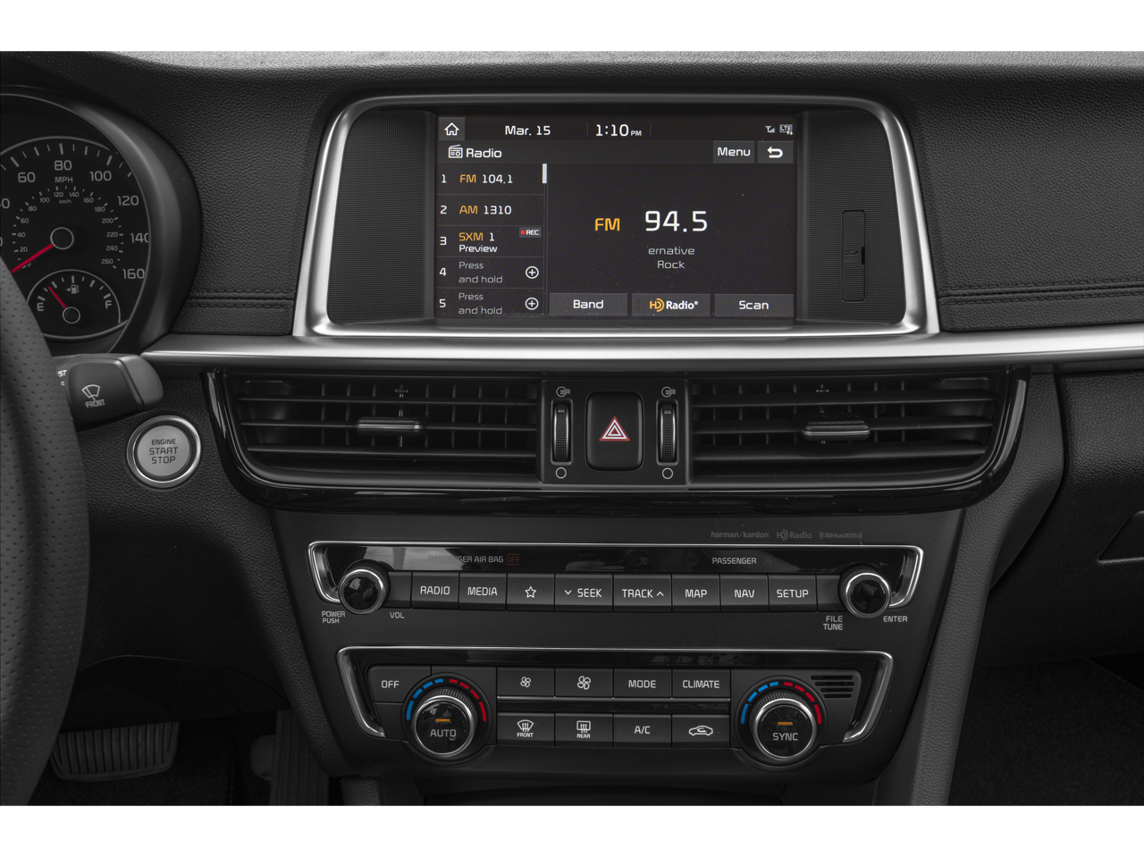 - Radio: harman/kardon AM/FM/MP3/SiriusXM Audio -inc: 630-watts premium surround sound w/10 speakers, 7.1 channel surround playback, Clari-Fi digital audio restoration and QuantumLogic, 8" touch-screen, auxiliary input jack, 2 USB chargers, Bluetooth® wireless technology, UVO Link w/navigation and support for Android Auto and Apple CarPlay